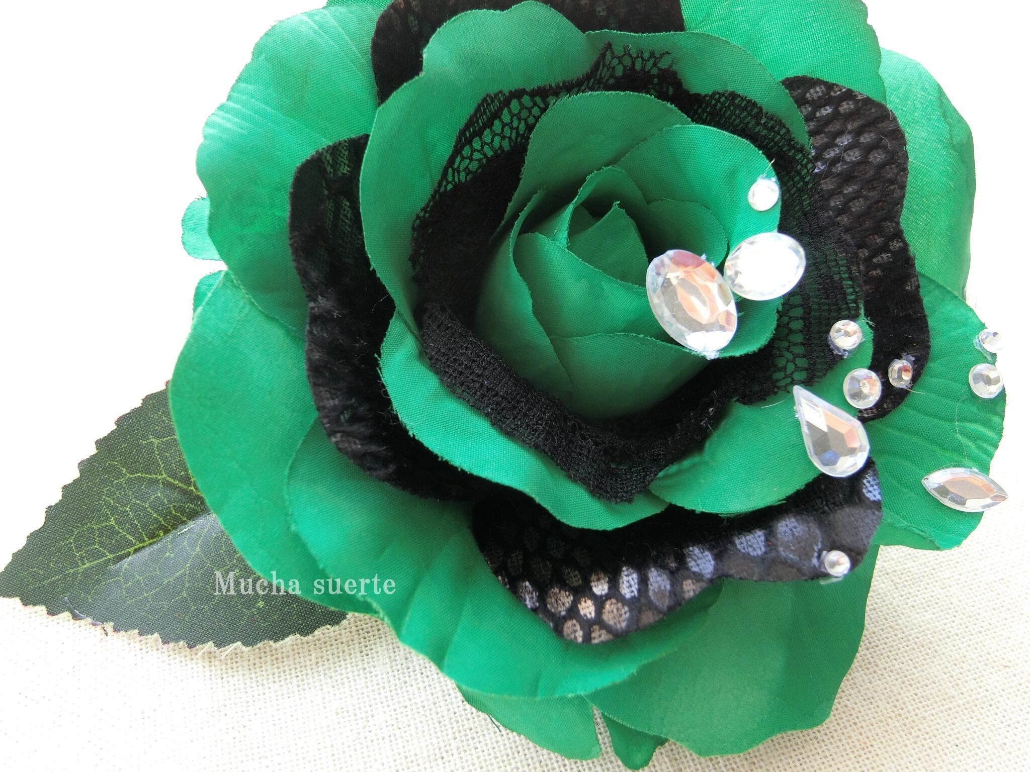 グリーンの花びらに黒いへび柄のようなテクスチャーの生地を挿みました。