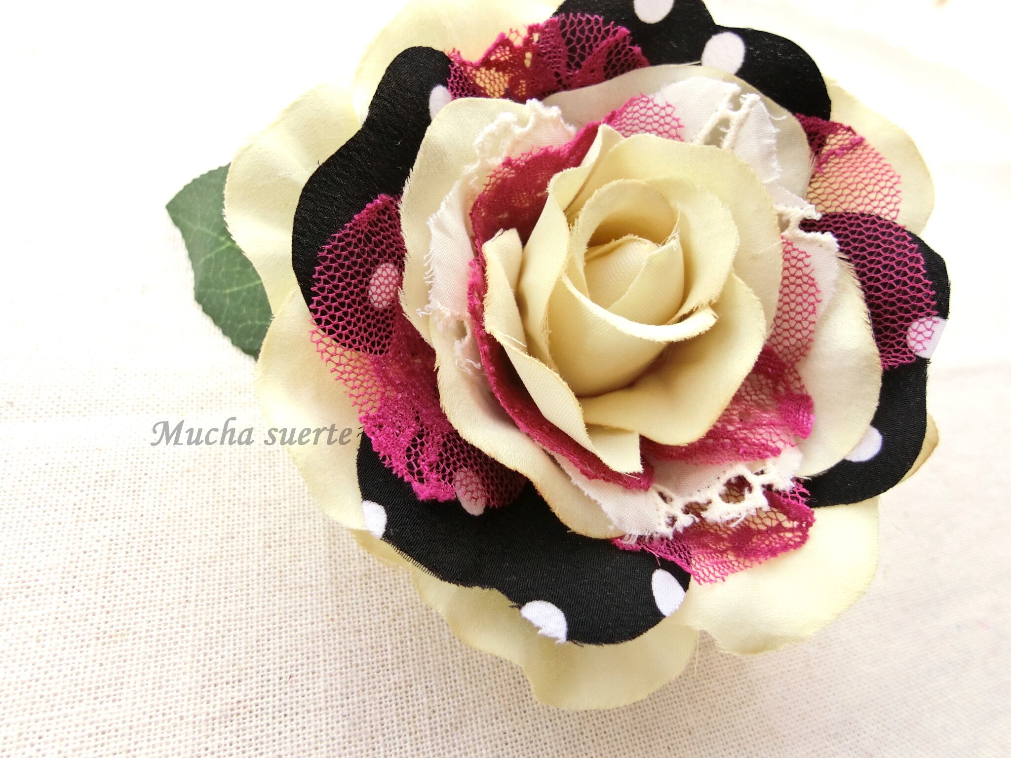 黒い水玉の花びらにアクセントの赤紫のレースを挿んだことにより、