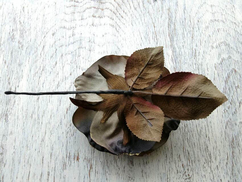 ベルベット調のオリーブグリーンに近い茶色の花びらにゴールドのキラキラを施しました。