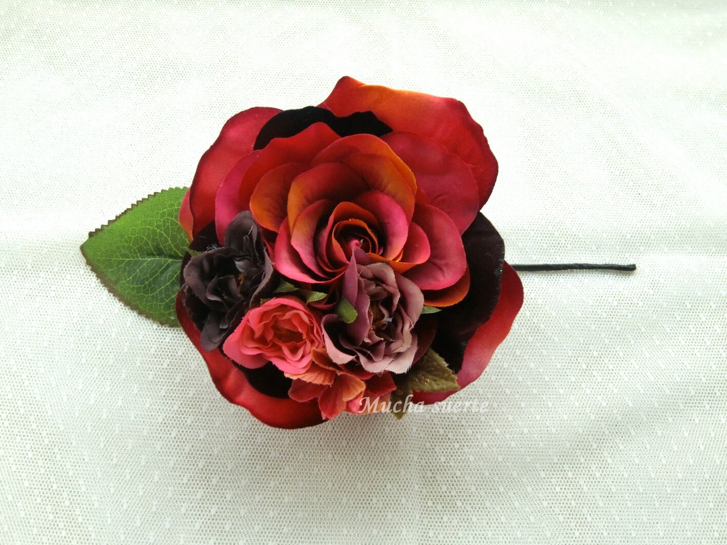 ボルドーの花びらをはさみ、落ち着いた色の小花を飾りました。
