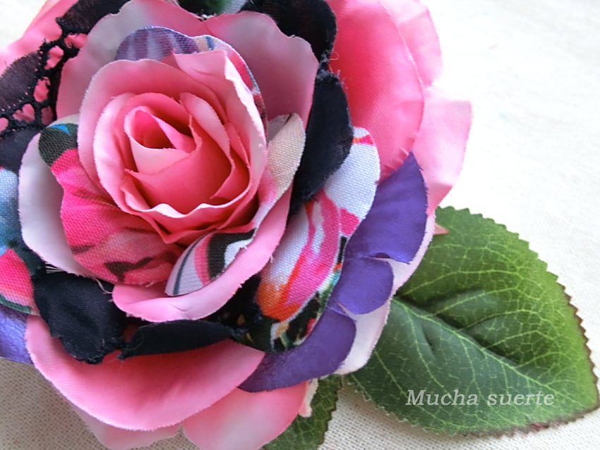 華やかな花柄の生地や紫の花びら、紺色のコットンレースを挿みました。
