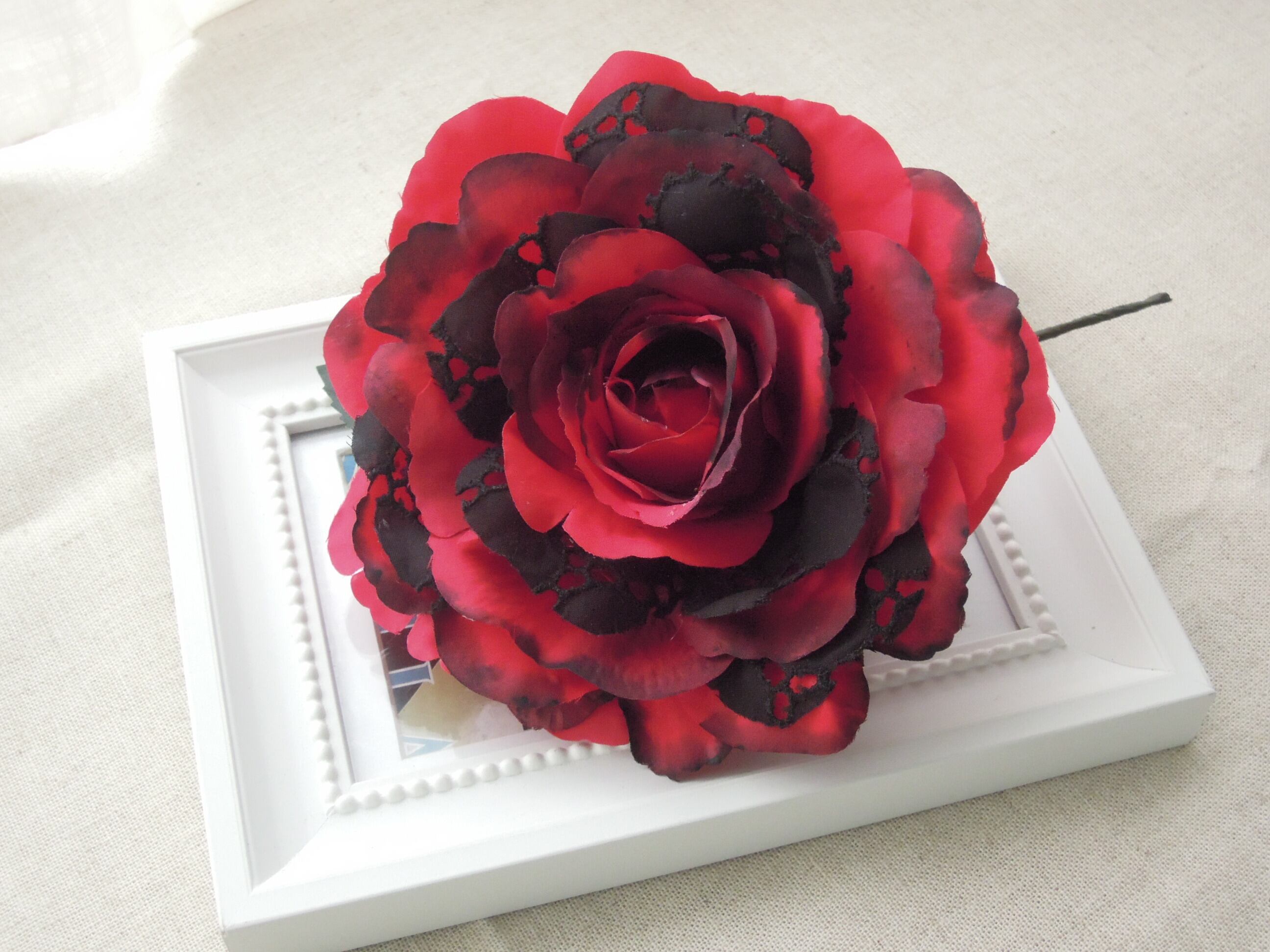 赤いバラの花びらの先を黒いアクリル絵の具でグラデーションを施しました。(アクリル絵の具は耐水性ですので使用の際に溶け出すことはありません)