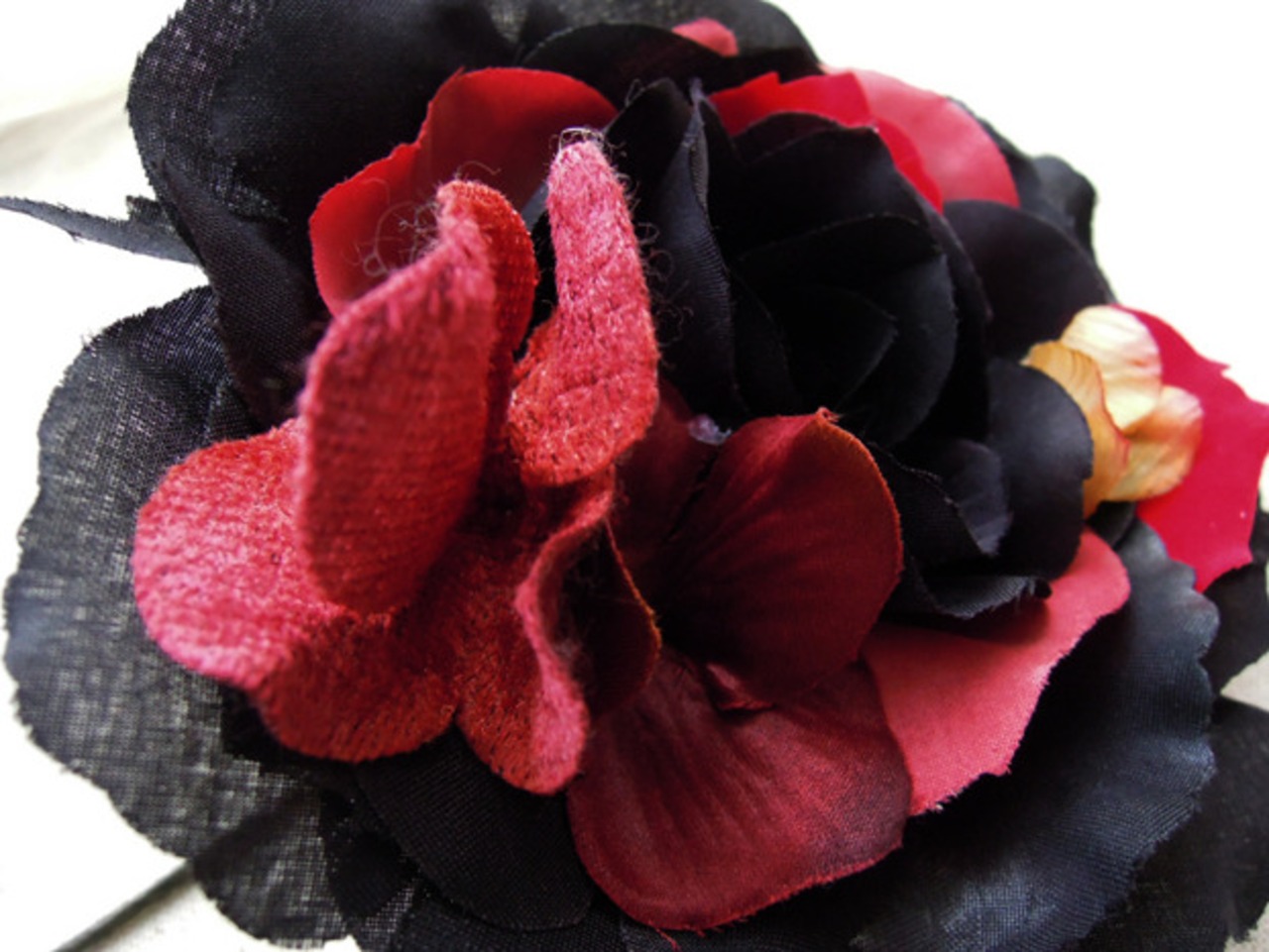 めずらしい真っ黒な花びらです。 赤やエンジ色の花びらを挿み、小花を添えてあります。 直径約13センチ