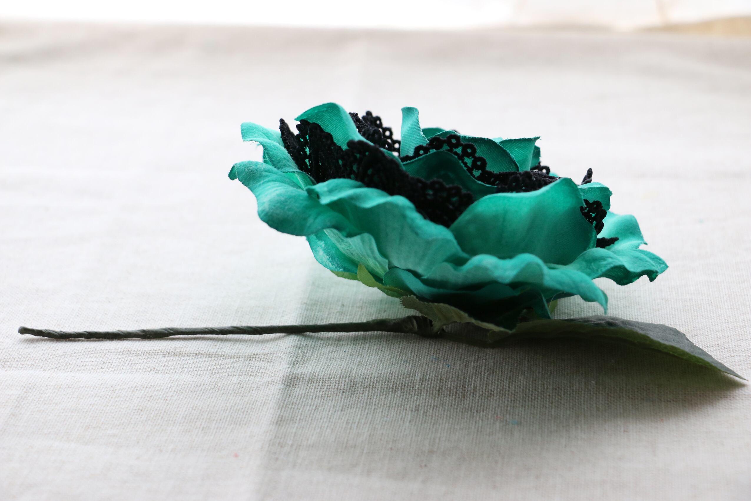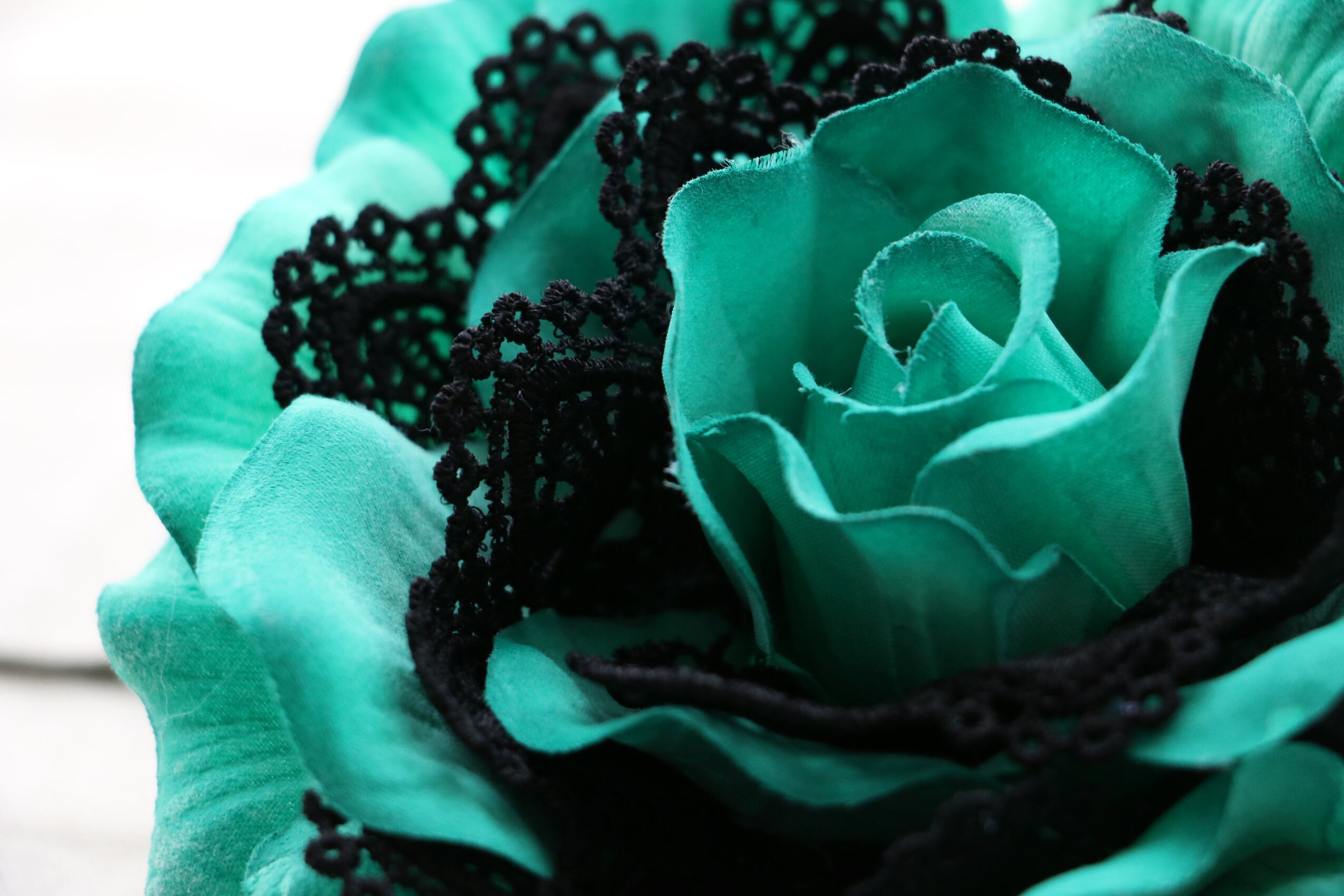 アクリル絵の具のコンポーズグリーンで彩色したポリエステルのフローレスに黒いコットンのレースを巻き込みました。