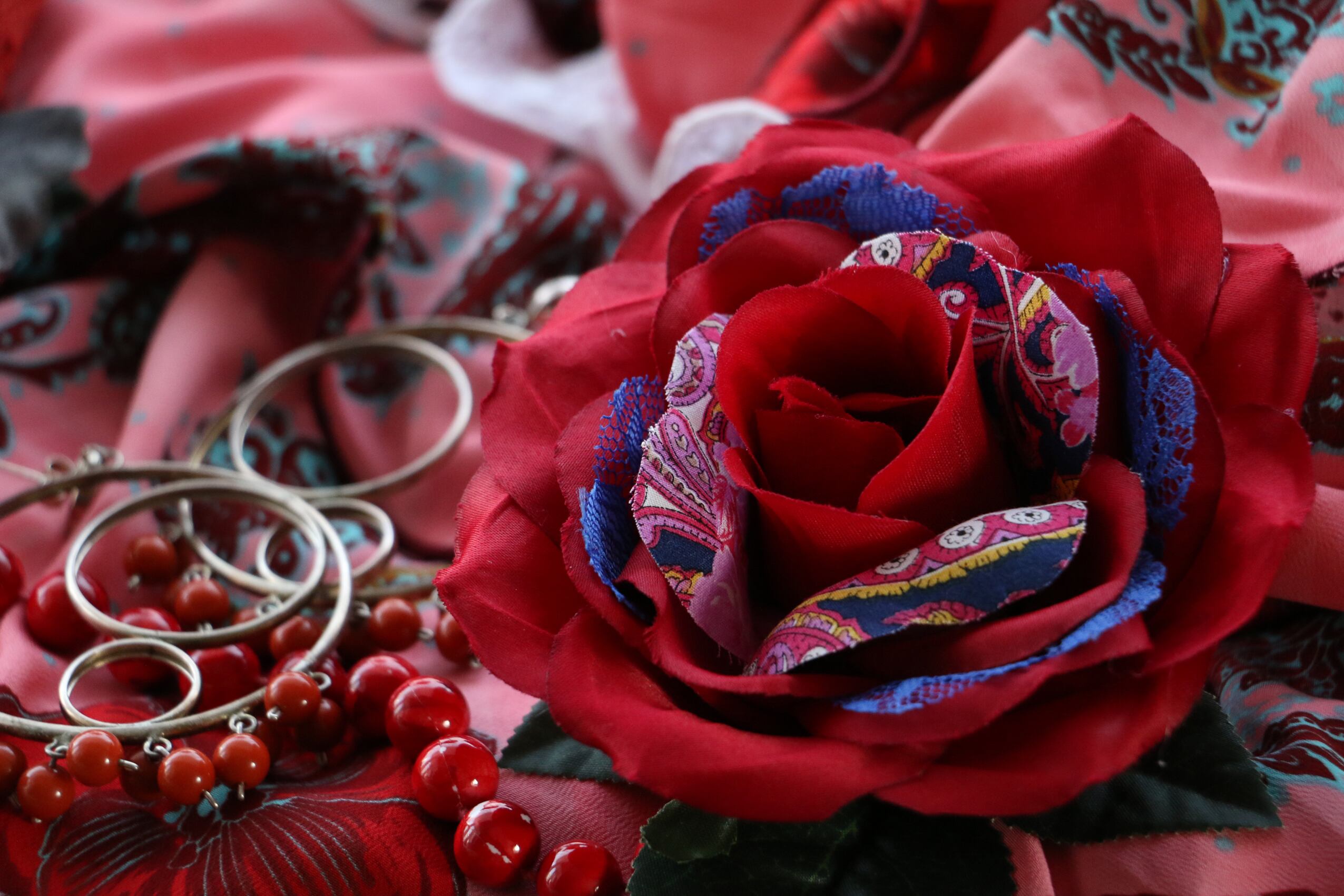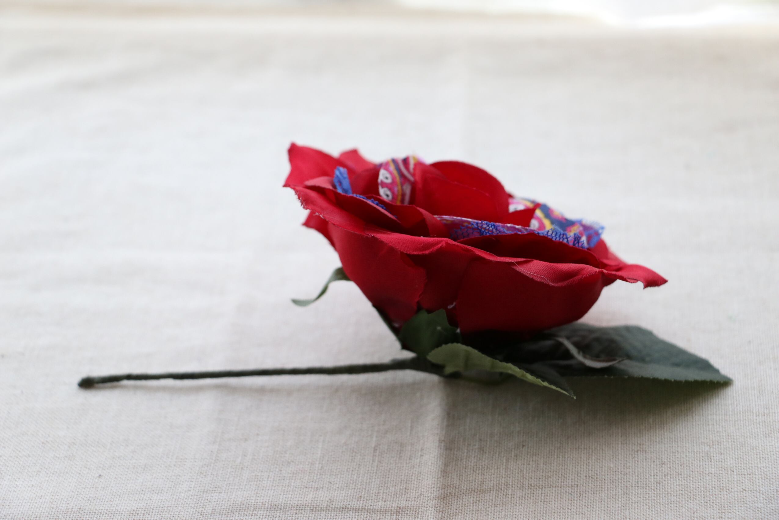 真紅の花びらに柄のコットン生地、青いレース生地を挿みました。