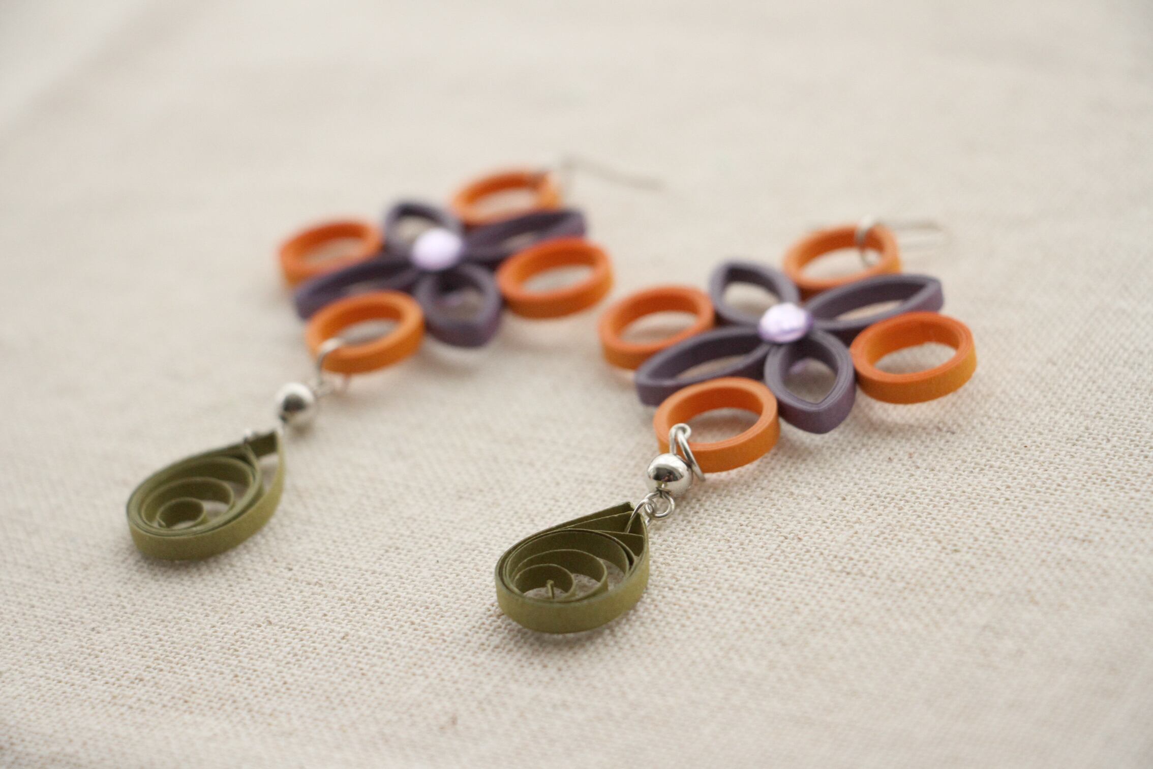 細い紙をくるくる巻いてパーツを作り、それを組み合わせて作ったピアスです。