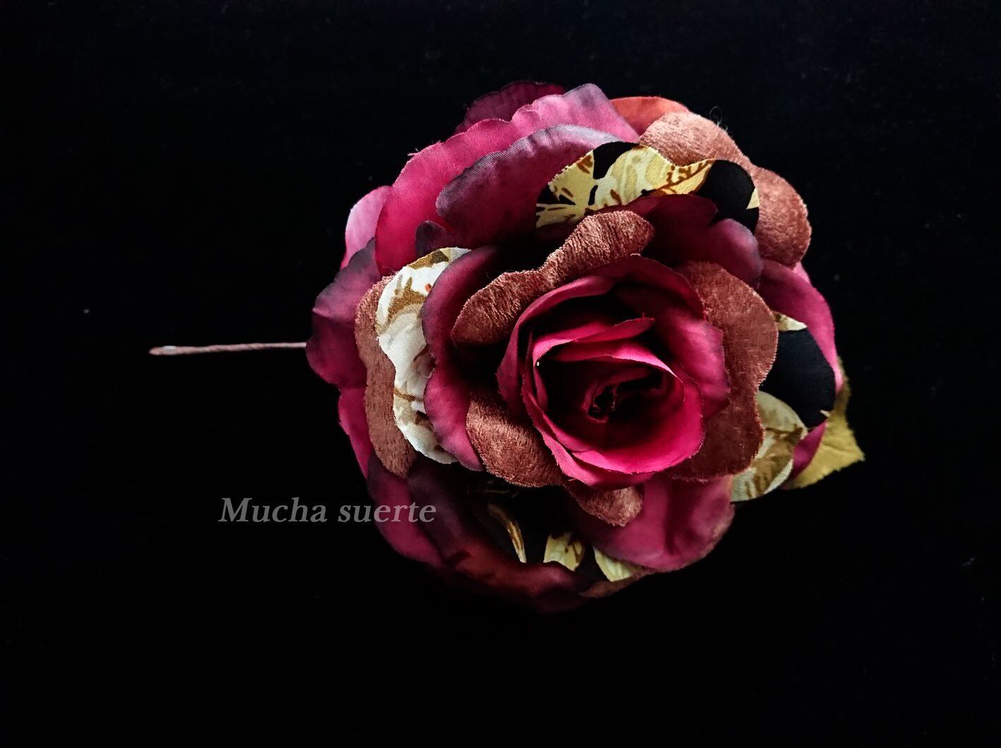 ワインレッド色の花びらに茶色のベルベッド風生地と黒い柄生地を挿みました。