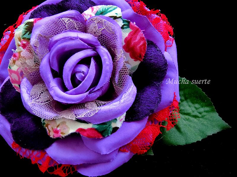 むらさき色の花びらに花柄の生地とのレース生地を挿みました。