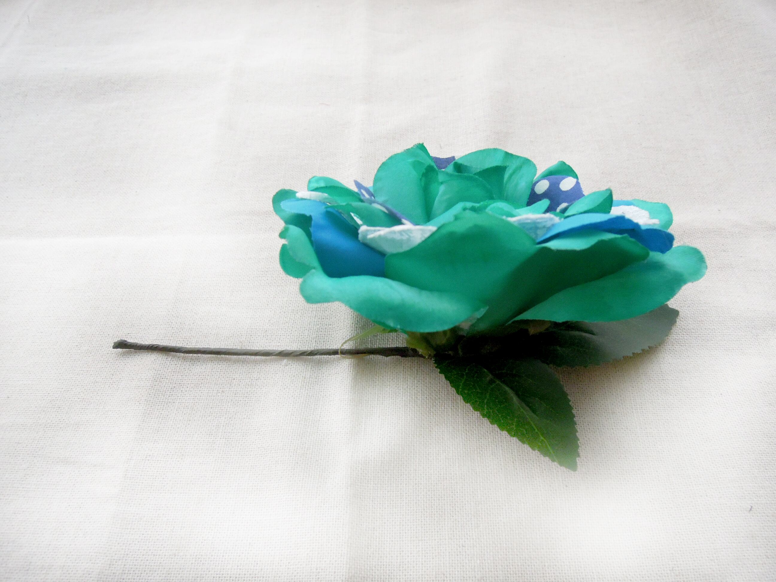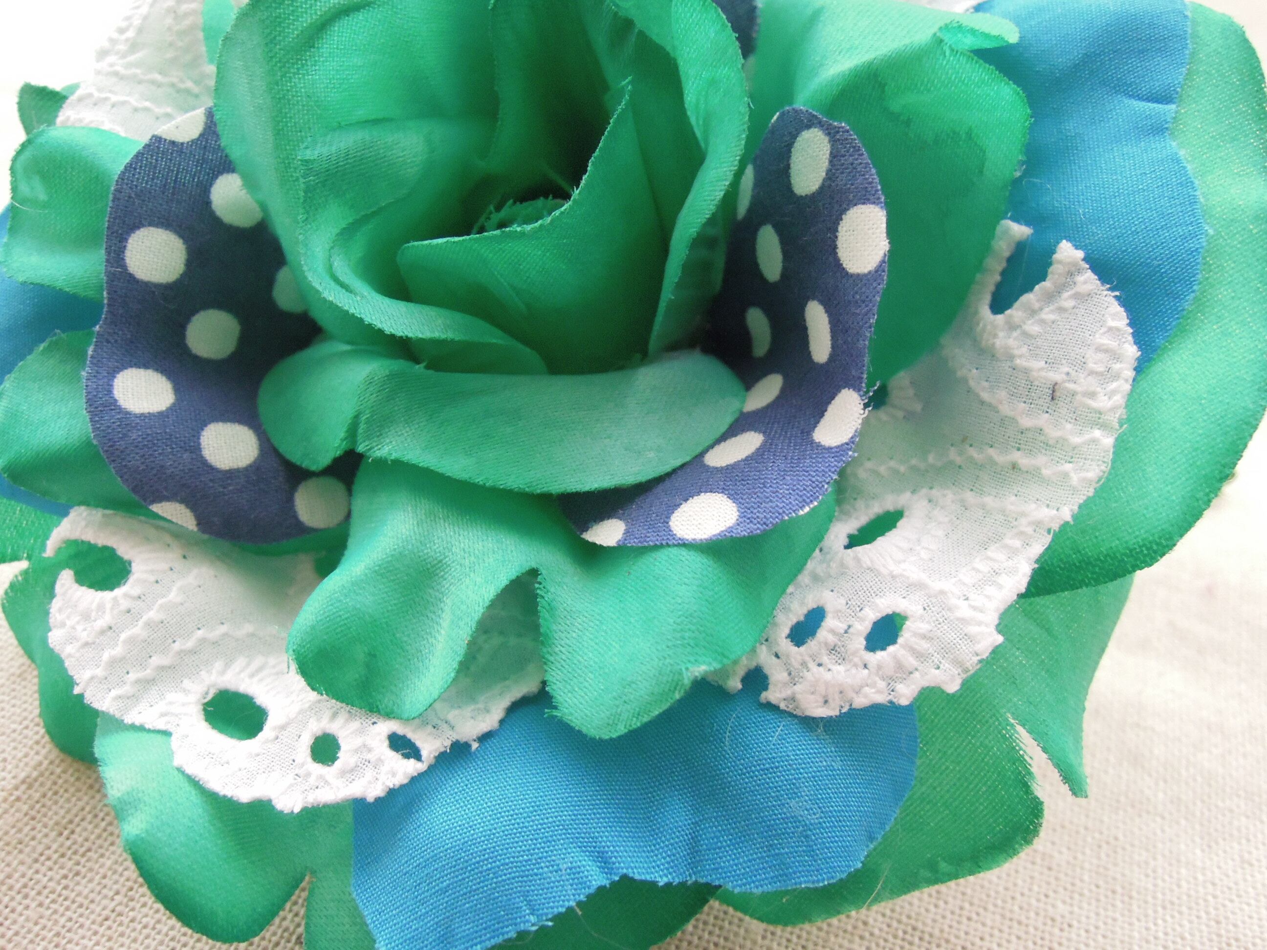 ブルー、水玉、白いレース、それぞれコットン生地の花びらを挿みました。