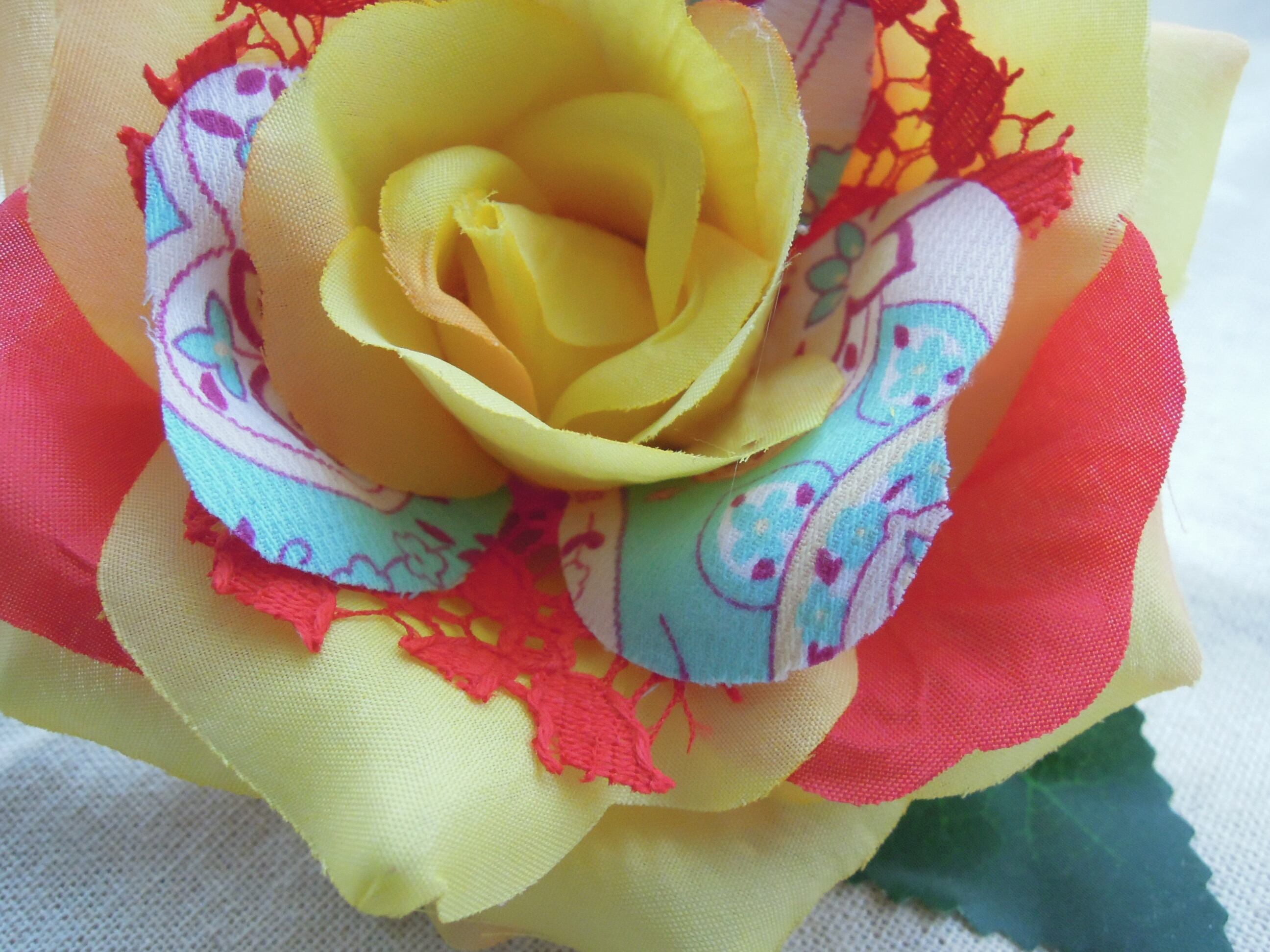 黄色いポリエステルの花びらとアクセントに赤い花びら。