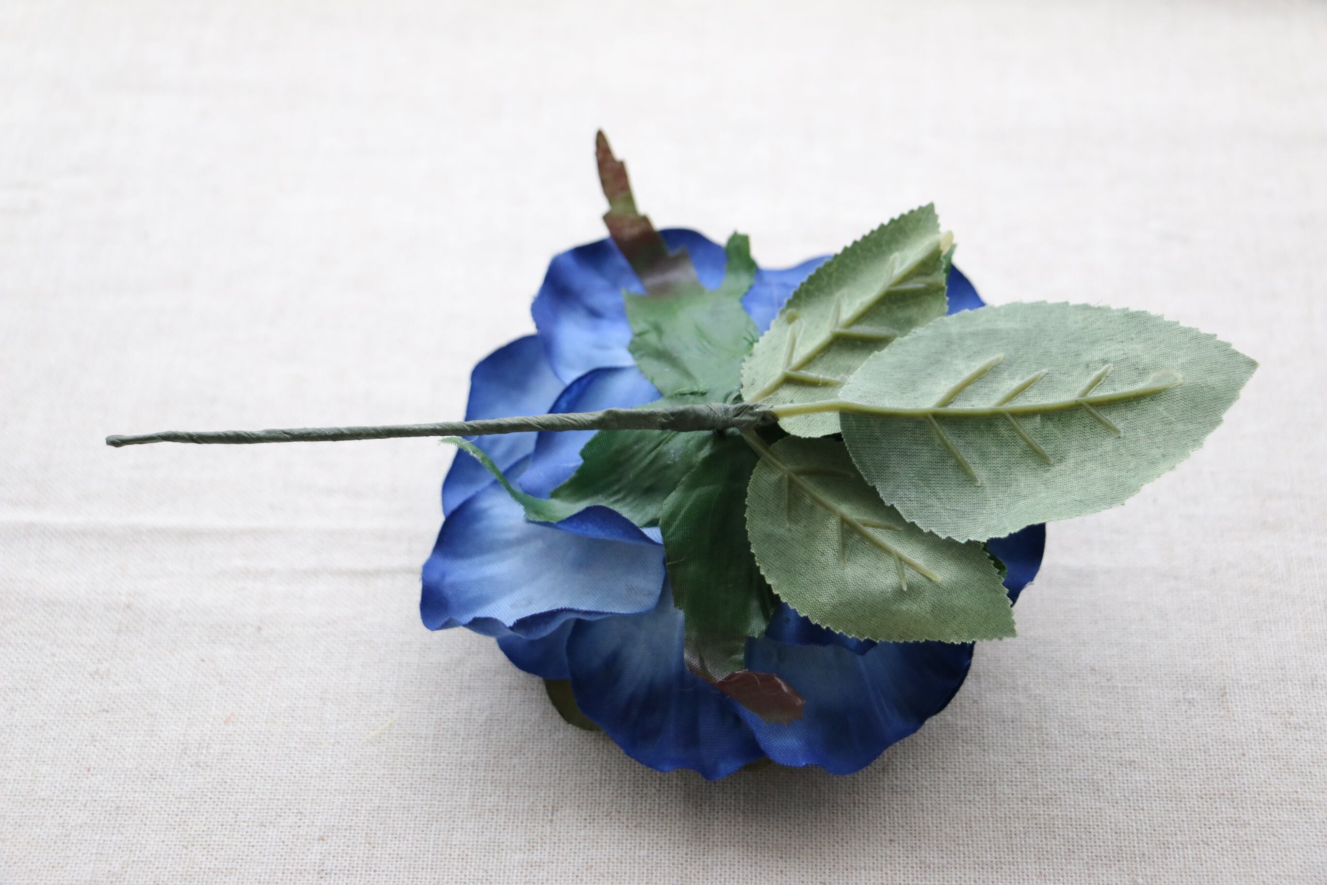ネイビーとオリーブグリーンに彩色したポリエステルの花びらに生成り色のレース生地を挿んであります。少しだけ花びらの先にシルバーのラメを施しました。