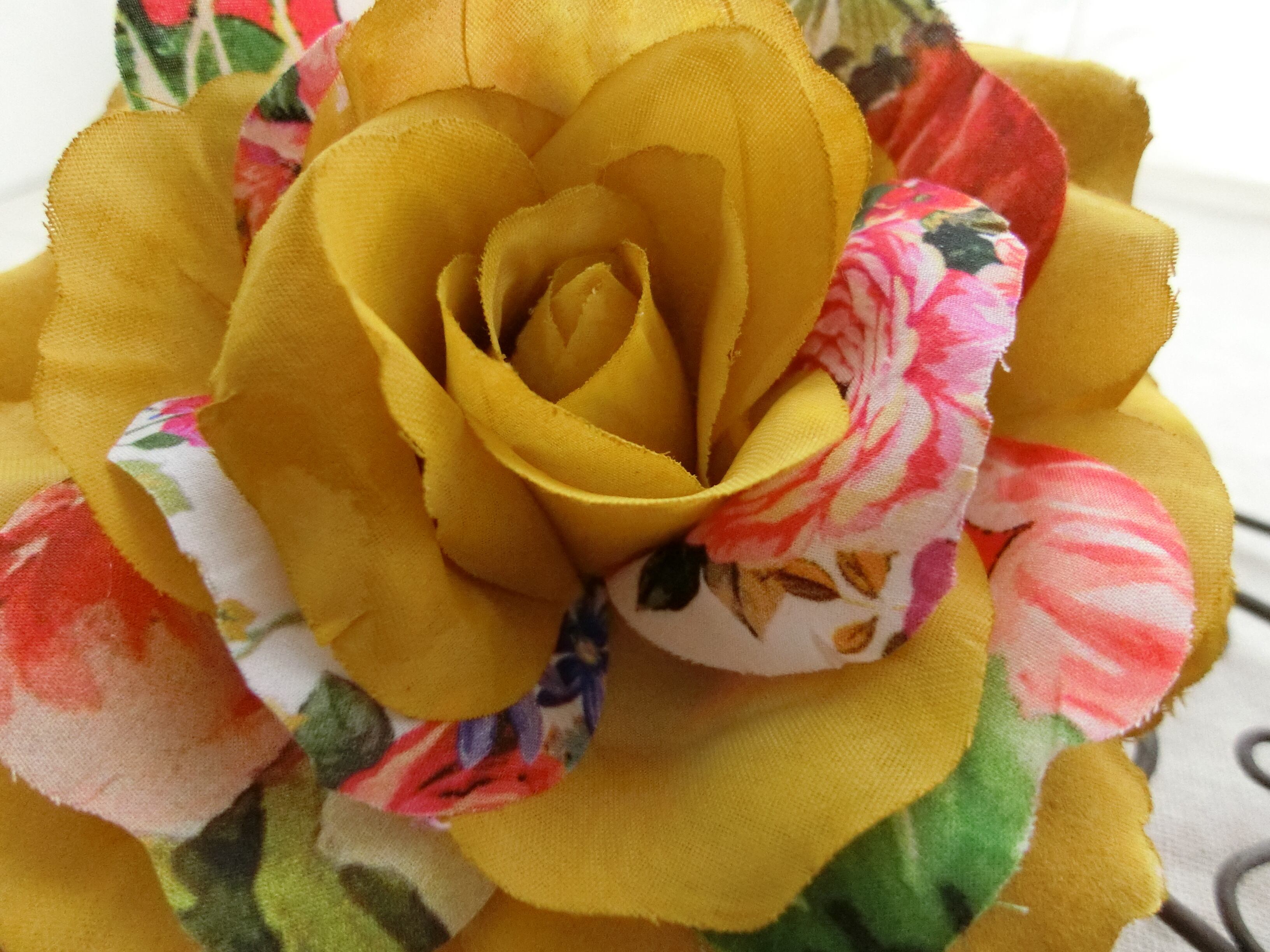 マスタードイエローに彩色したポリエステルの花びらにボタニカル柄の生地を挿みました。まさに今年のファッションのトレンド!