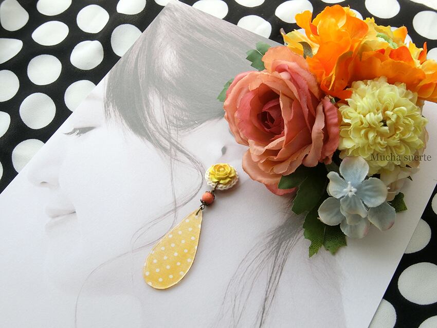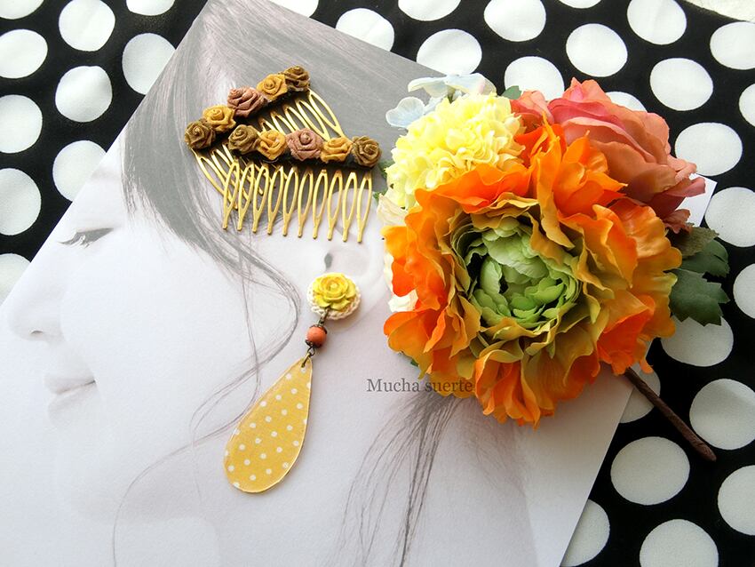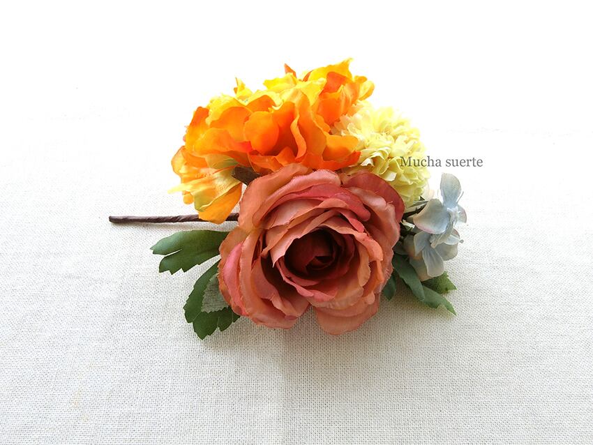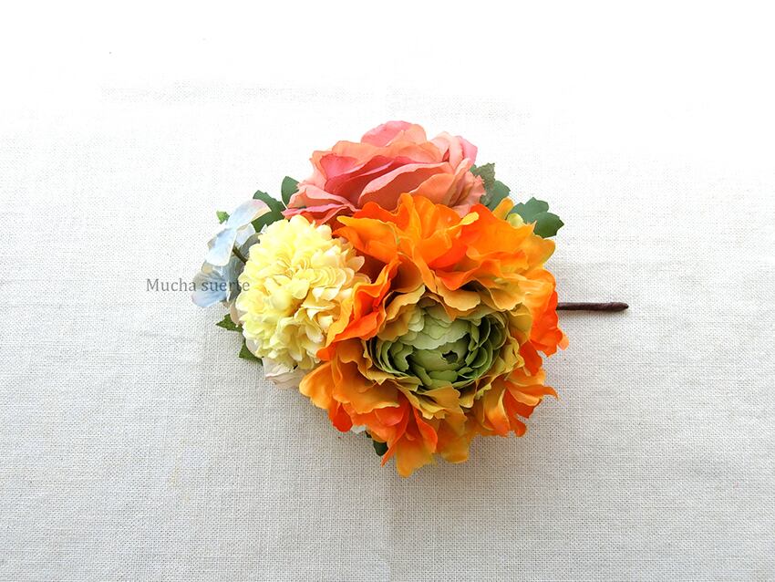 個々の花が独立していているので微調整が多少可能です。耳の後ろに飾ることを想定して縦長に作ってあり、左右付ける向きででニュアンスが変わります。