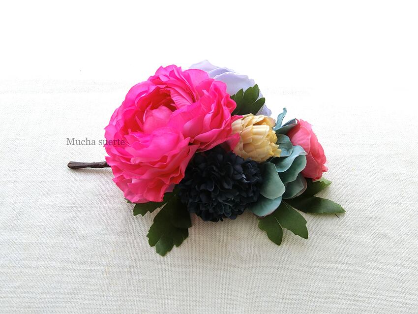 個々の花が独立していているので微調整が多少可能です。耳の後ろに飾ることを想定して縦長に作ってあり、左右付ける向きででニュアンスが変わります。