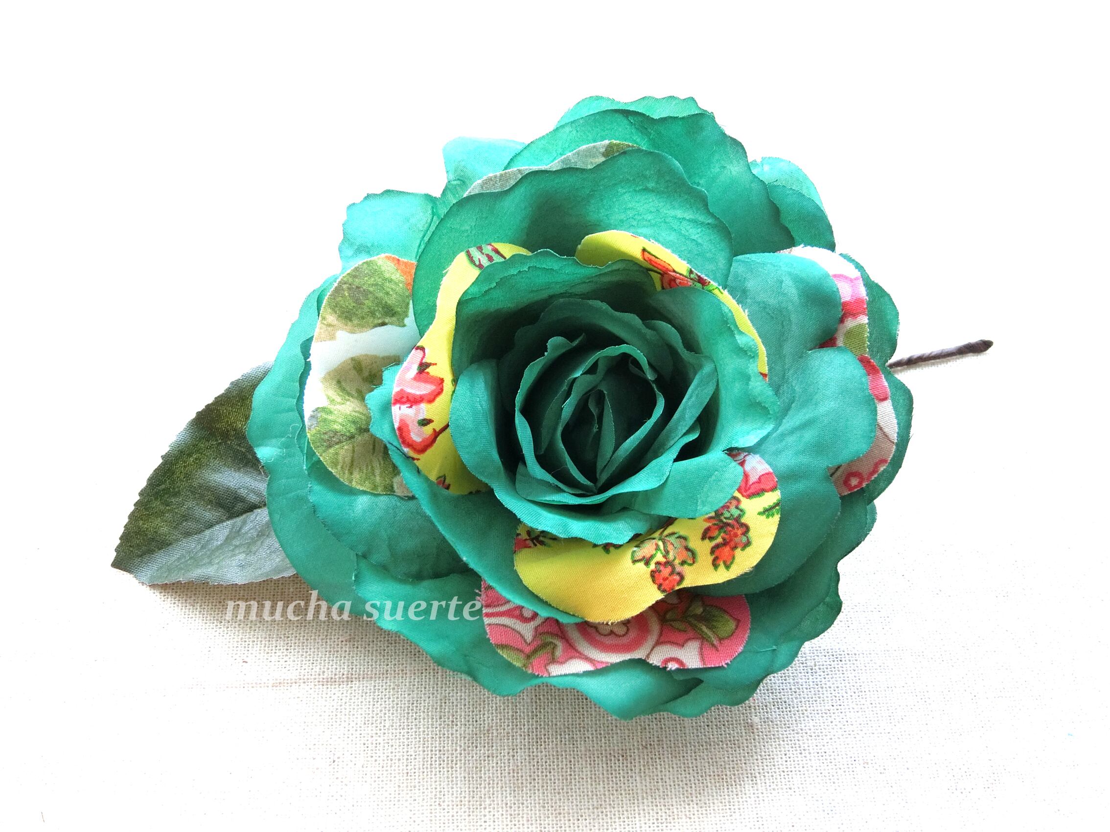 グリーンに彩色したポリエステルの花びらに、スペイン製の花柄コットン生地を