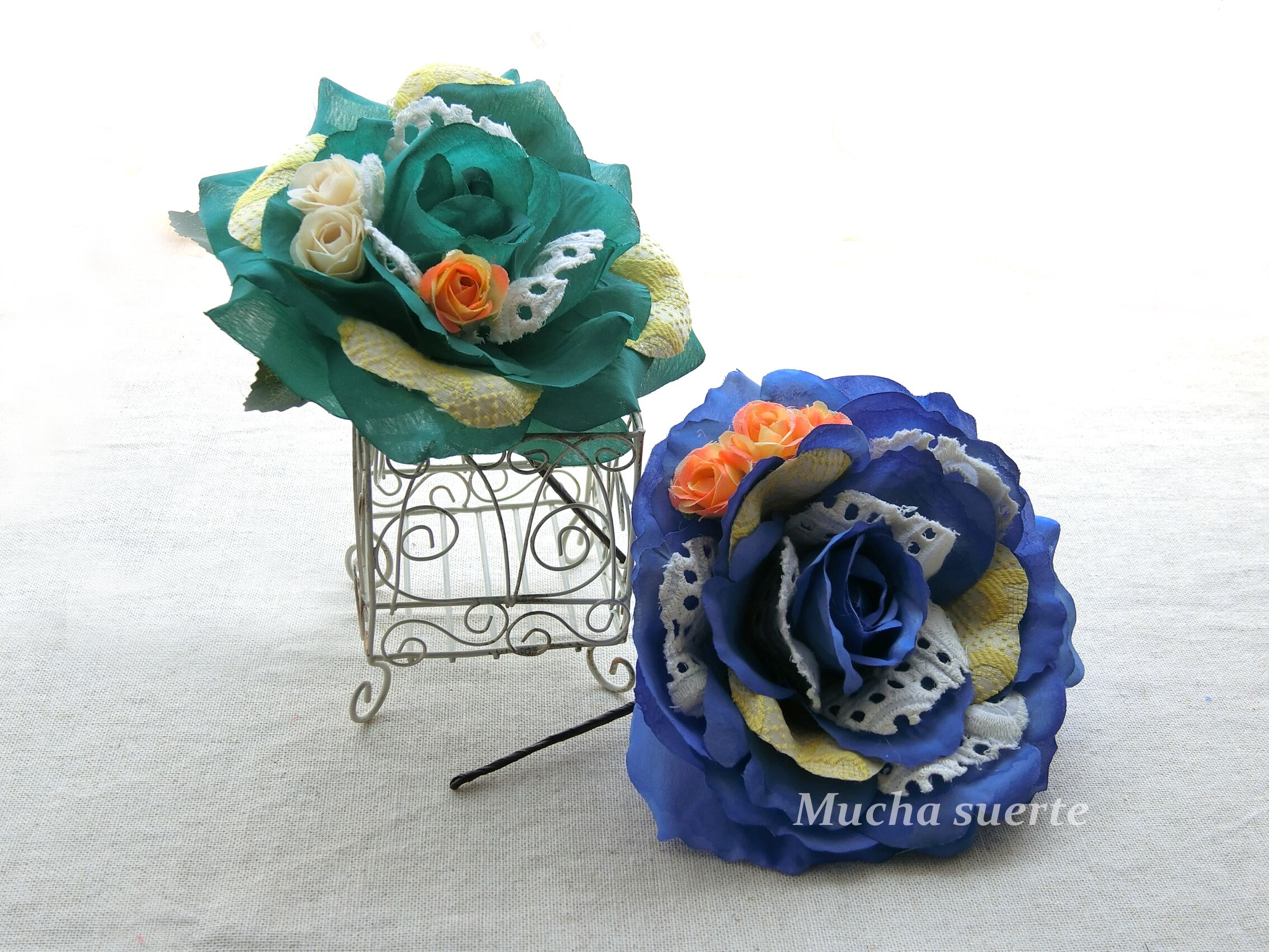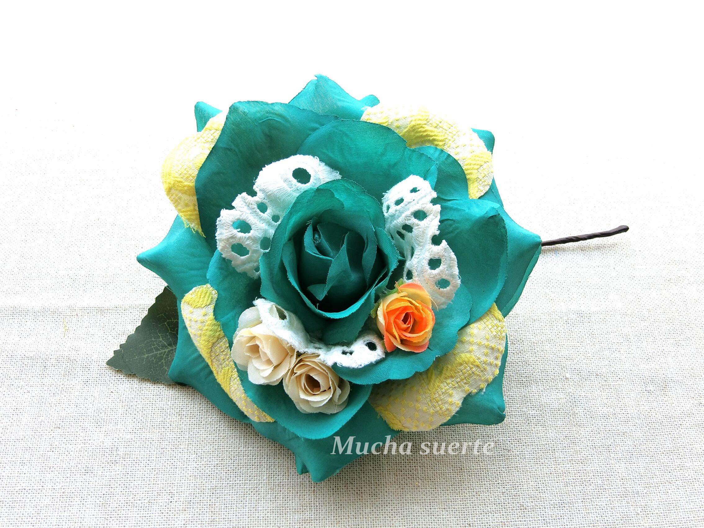 コンポーズグリーンに彩色したポリエステルの花びらに、黄色と生成りのレースコットンの花びらを挿みました。小花をちらして華やかに☆