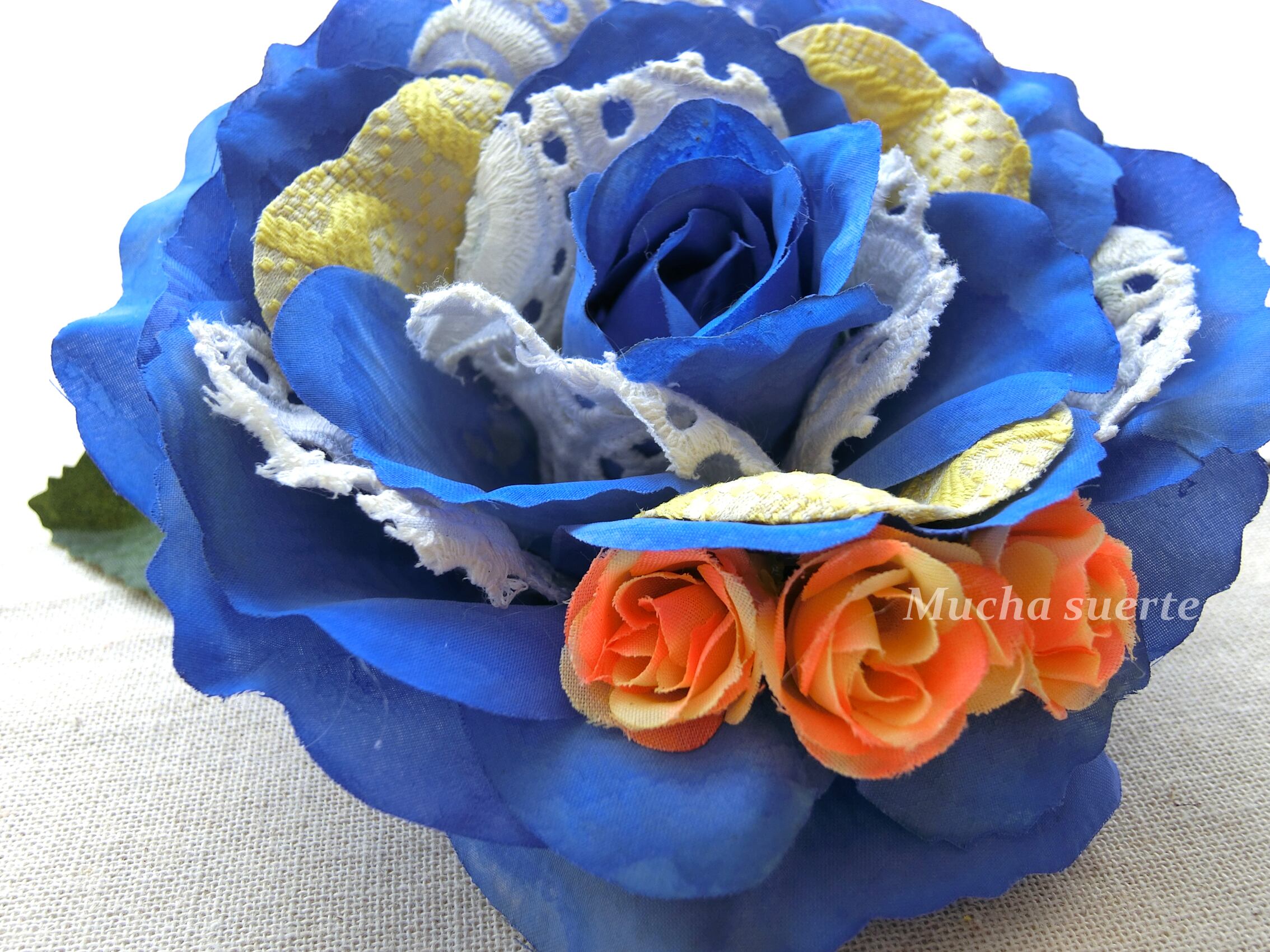ブルーに彩色したポリエステルの花びらに、黄色と生成りのレースコットンの花びらを挿みました。小花をちらして華やかに☆
