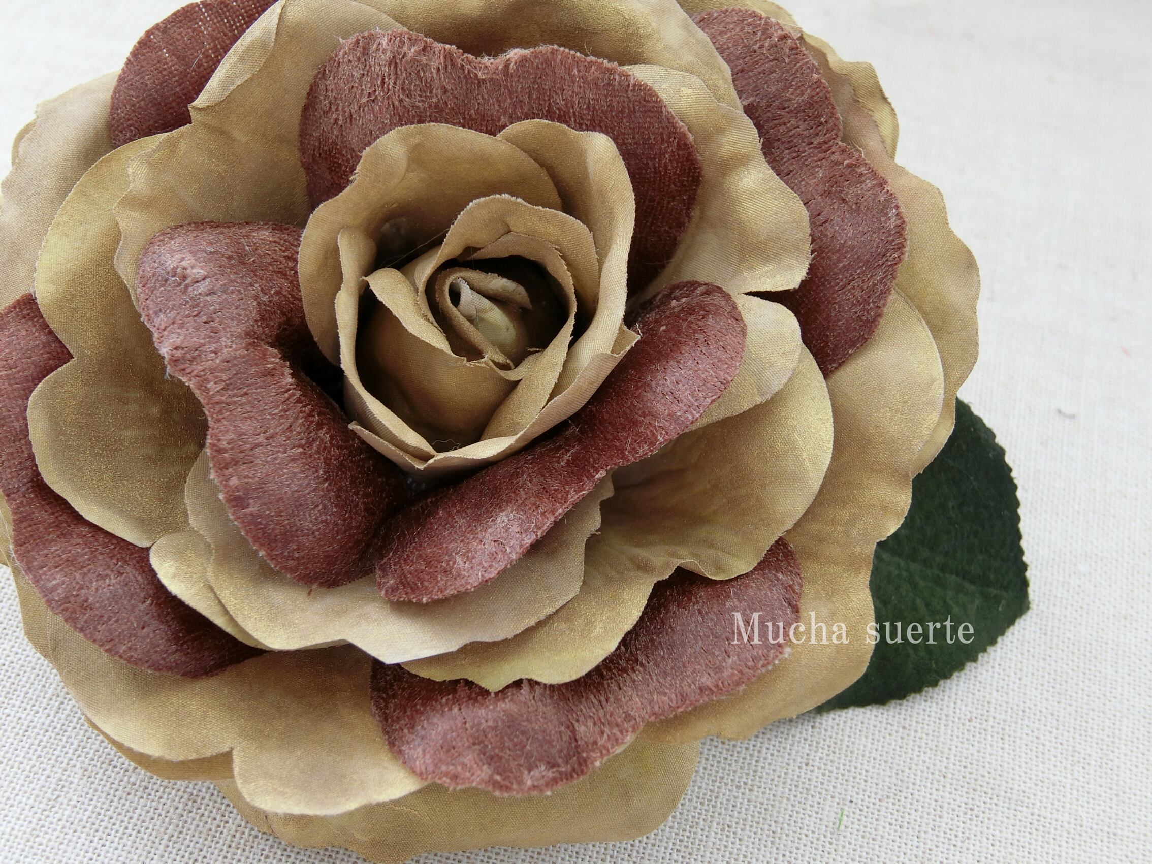 ゴールドに彩色した花びらにブラウンのベロア生地を挿みました。